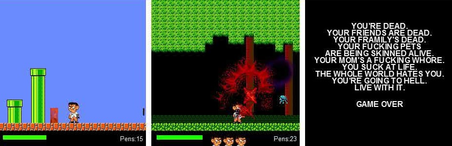 Having critiqued games as a child growing up in the 1980s and 1990s, Rolfe created the review with an established sense of gaming’s history and culture while embellishing it with over-the-top profanity.23 The underlying humor of the video is that while Rolfe does indeed like the game in real life, the character he performs loathes it to such an extent that he has produced and distributed a video to vent his anger nearly twenty years after the game’s release. Although the video’s premise certainly is reminiscent of Mystery Science Theater 3000 (1988-1999), the cult television series in which a human and his robot pals offer comedic commentary to the “bad” films they are forced to endure as part of a mad scientist’s sadistic experiment, Rolfe’s character plays the game out of his own volition, all in an effort to warn people against playing the game. In this review of Castlevania II, the character even states his apparently noble intention through direct address to the viewer: “I feel horrible that I had to play this game in order to make this video. But I did it to demonstrate its dreadfulness, and I forced myself to play it, just so you don’t have to.”