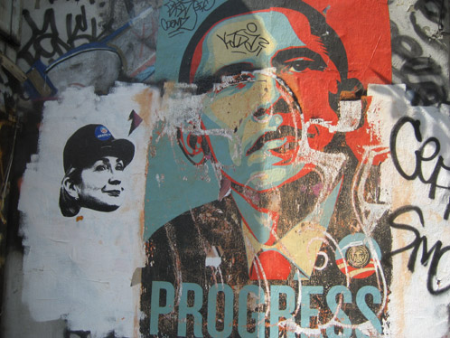 Obama art posters have appeared throughout major cities like Los Angeles, and all over LA, on stop signs, underpasses, buildings and billboards there are hundreds of posters and stickers on Obama with the word HOPE emblazoned across. Even street artists have been doing Obama graffiti and urban art in public places.6