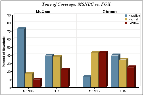 I have argued that presidential campaigns have been constructed as media spectacles, in particular since the rise of cable television, with its 24/7 news cycles and partisan networks like Fox News, which can be seen as a campaign adjunct of the Republican party, and, this year, MSNBC which has several shows that are blatantly partisan for Obama. About two weeks before the election, the Pew Research Center released a report wherein the study of the positive and negative representations of the two dominant party’s presidential and vice-presidential candidates revealed that McCain has received strongly negative coverage with more than half of the stories casting him in a negative light; while fewer than one-third of the stories about Obama were negative, about one-third were positive, and one-third were neutral.14