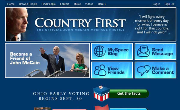 Interestingly, both McCain and Obama have also created their own unique social networking platforms hosted within their main sites: MyBarackObama.com and McCainSpace. I joined both of them in August and, unsurprisingly, was much more impressed with Obama’s site. The registration process was remarkably similar for both sites (both ask you to write a few sentences about why you are voting for the candidate, what issues you are concerned about, your birthday, your location, and if you are registered to vote. The ever-inspired Obama adds the question, “What is your favorite motto or quote?”). Once you get going, the sites function like boring versions of any message board or online community. You can join groups, write blog posts, search for people, add video and photo widgets, etc.
