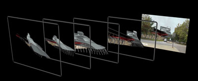 Figures 10 – 16 depict images from a movie about an urban transformation from an underutilized setting to an environment that supports activity 24 hours a day. Based upon the observation that the site is primarily inactive, the student developed a range of building and site activities that complemented events within the site’s adjacent buildings to promote a 24-hour lifecycle. The student surveyed all the surrounding buildings and documented when they were in use and for what given activity. He then mapped that information against the site proper, and formed both building and site programs. His documentary shows time passing along a timeline indicated at the bottom of the frame while highlighting these moments of inactivity within the associated buildings.