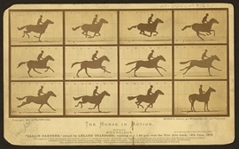 | Consequently, the linguistic or mythic origins of this new cinematic form are worth highlighting because the origins of a form reveal something of its nature. According to David Wilson, a postal historian, the word “post” originally referred to a place where the horses could be changed on their journey from one town to another – a so-called “changing post.”xxi And one key moment for the invention of “cinema” occurred between 1877-1880, when Eadweard Muybridge, “thanks to the imaginative generosity of a horse lover,” as Bazin puts it, “managed to construct a large complex device which enabled him to make from the image of a galloping horse the first series of cinematographic pictures.”xxii |